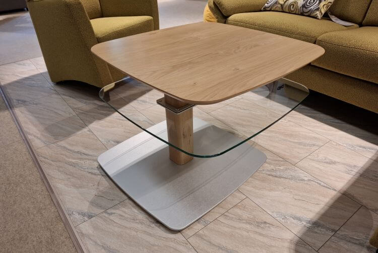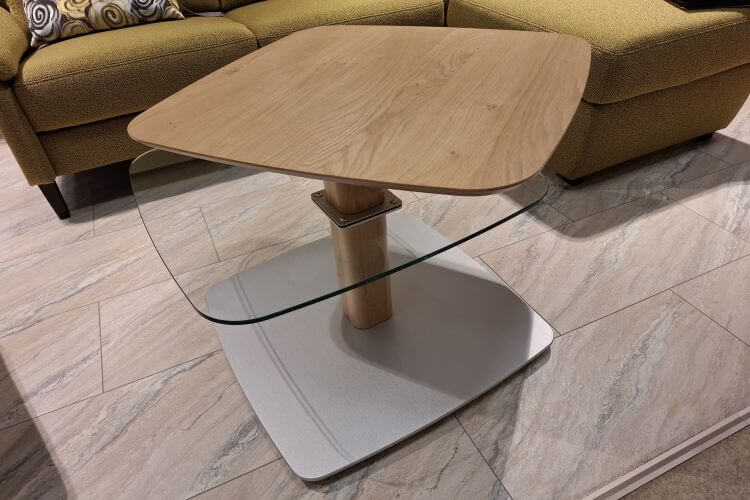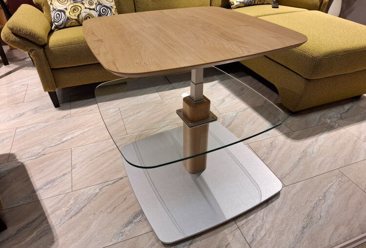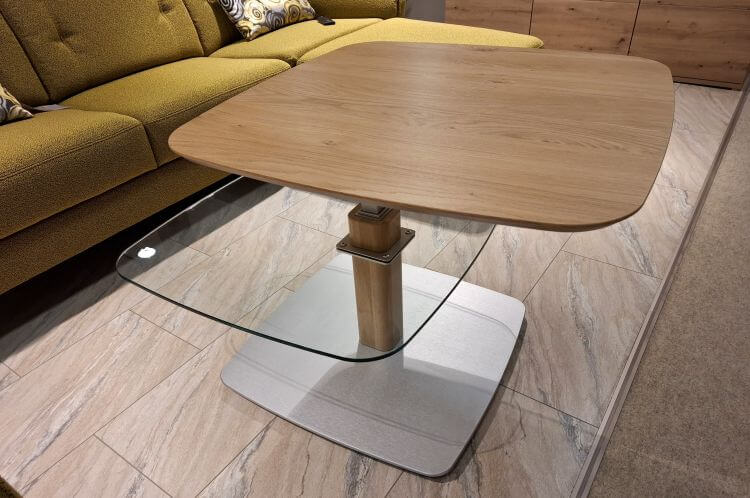 Dieser schöne, kleine Couchtisch in Wildeiche verfügt über einen Hydro-Lift, eine drehbare Tischplatte und einen Ablageboden in Klarglas und überzeugt zusätzlich durch sein modernes Design.