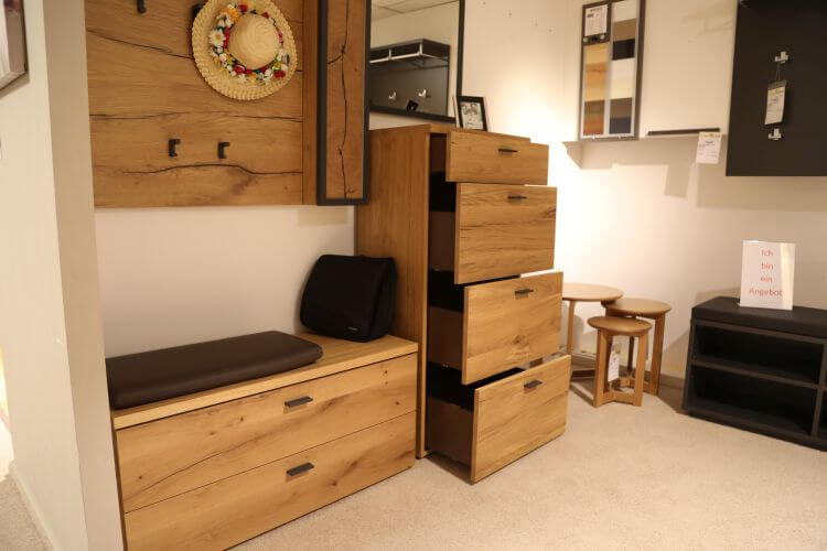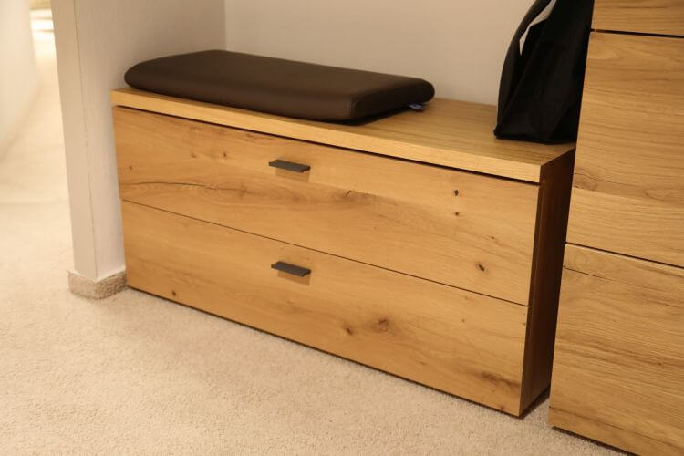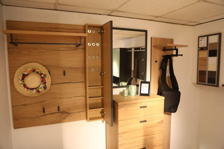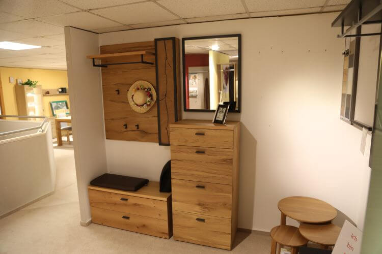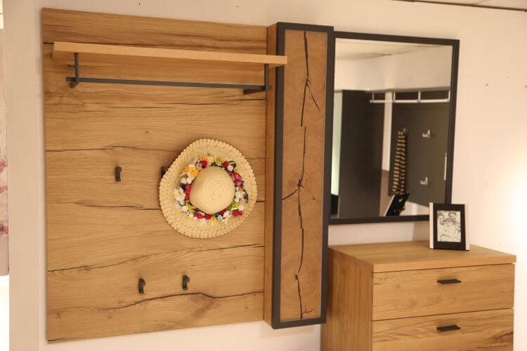 Das moderne Design des Modelles „Kitzalm-Almtal“ in Salzkammergut Alteiche Furnier, setzt Ihren Eingangsbereich besonders in Szene. Das Akzentpaneel mit Hirnholzapplikation ist dabei ein natürlicher Blickfang und die anthrazitfarbenen Elemente setzen einen zusätzlichen Kontrast.