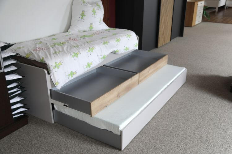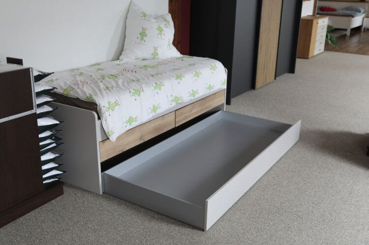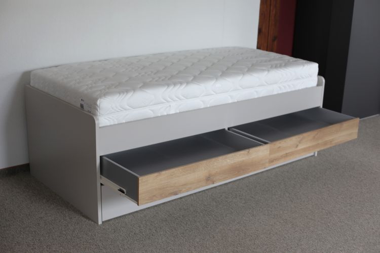 Sie verfügt über 2 Schubkästen mittig und unten einen Rollbettkasten, der sowohl als Stauraum, aber auch mit einer zusätzlichen Matratze als Schlafmöglichkeit genutzt werden kann.