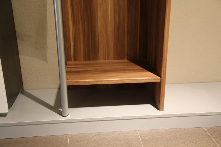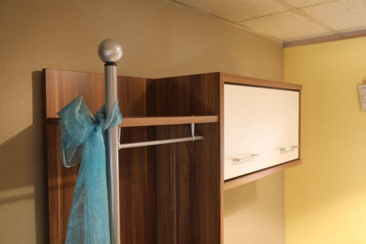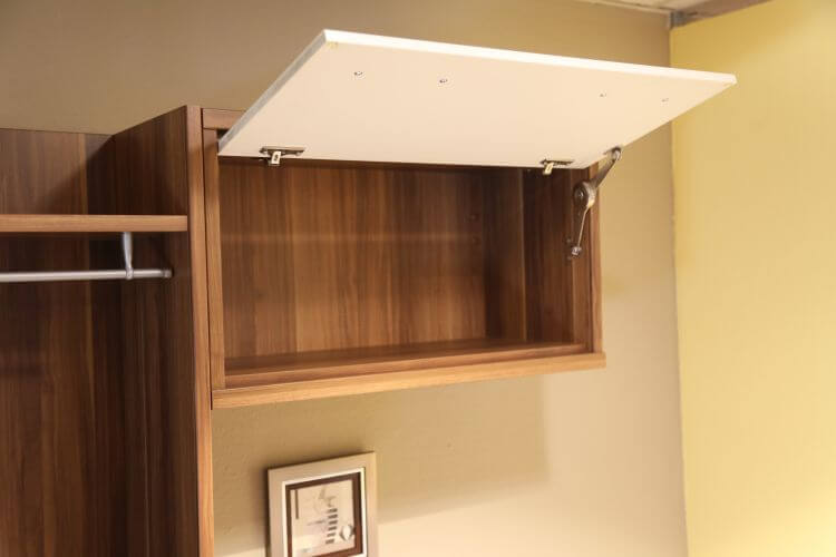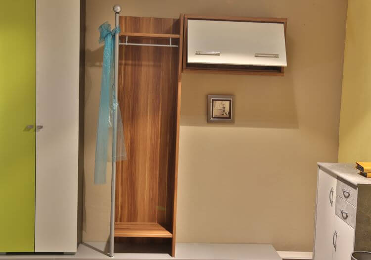 Dieses kleine Modell in Walnuss-Dekor / Lichtweiß besteht aus einem Hängeschrank mit Klappe und einem Abschlussregal mit 2 Böden und Kleiderstange.