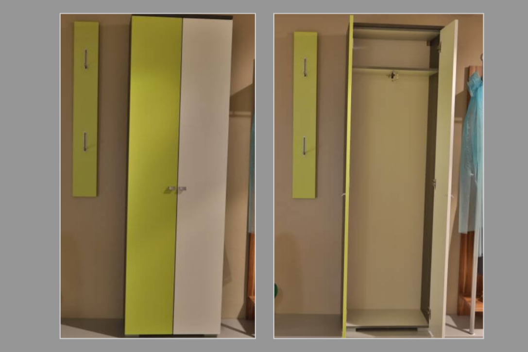 *DekorauslaufDiese kleine Garderobe in anthrazit, weiß und grün besteht aus einem Kleiderschrank und einem Wandpaneel mit 2 ausklappbaren Haken.