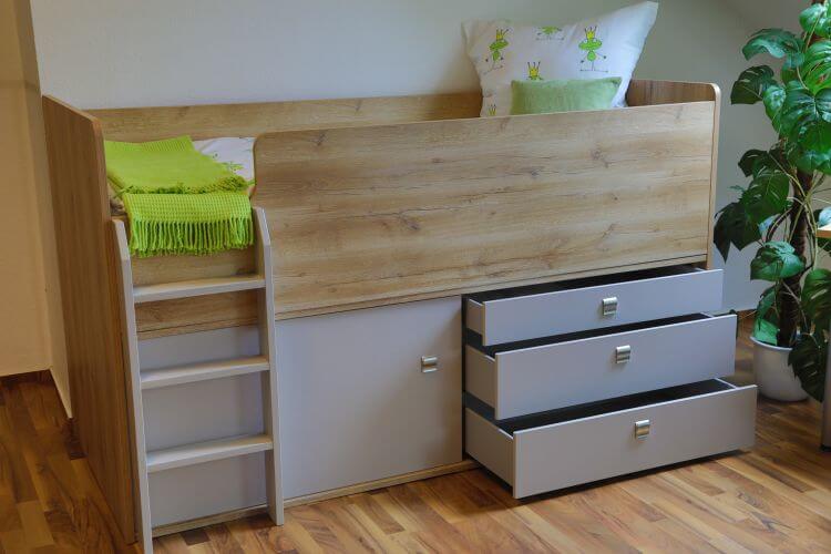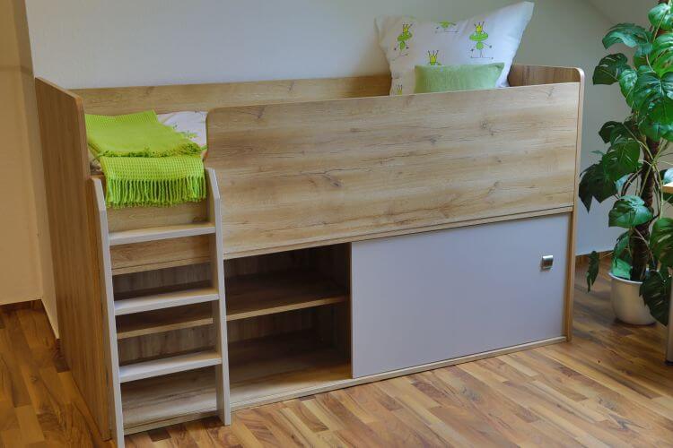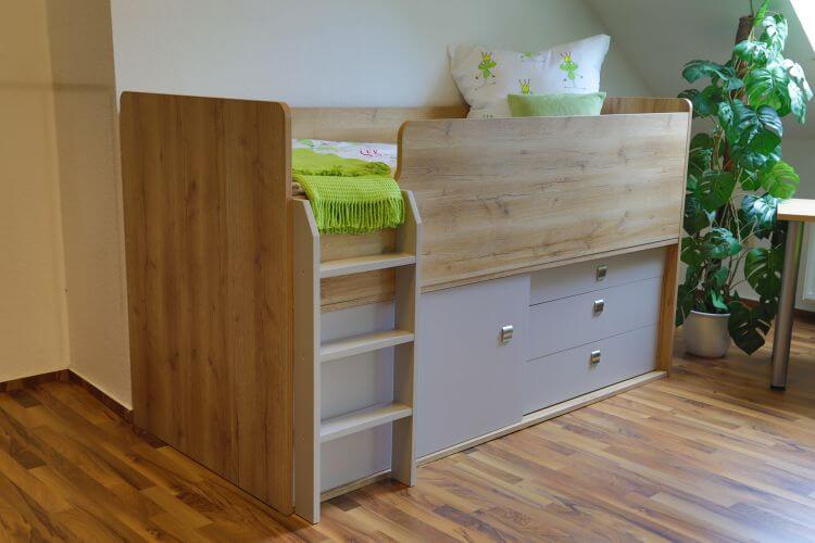 Hochbett mit viel Stauraum.
