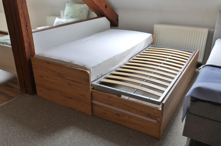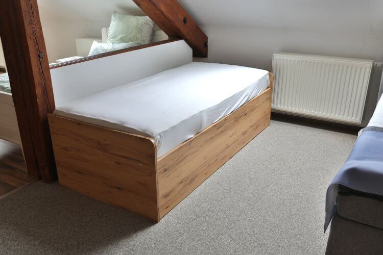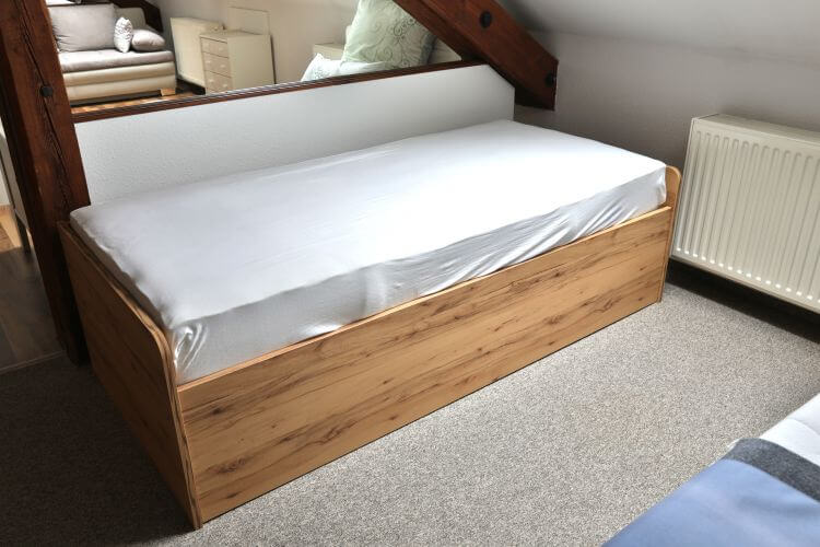 Die Kastenliege „Achat“ in Ast-Kernbuche Dekor passt sowohl in ein Jugend- als auch in ein Gästezimmer und kann als Einzelbett oder als Doppelbett genutzt werden.