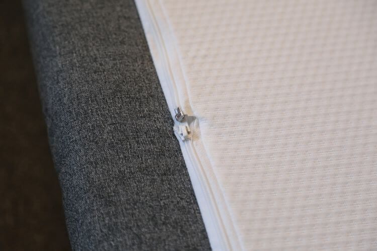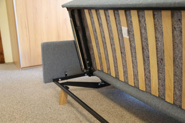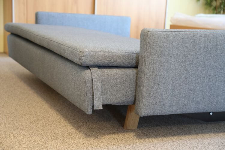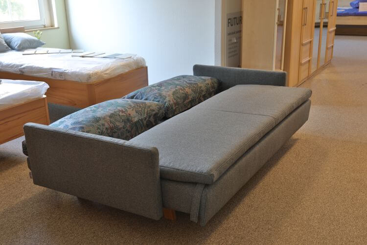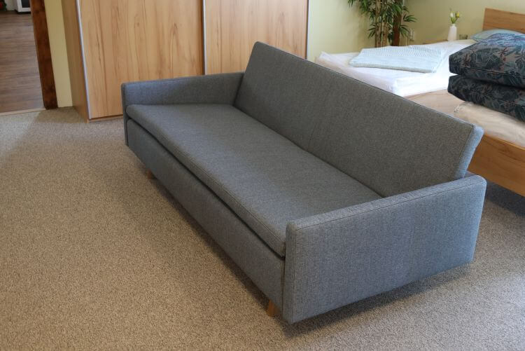 Dieses Kippsofa in einem grauen Stoffbezug hat 2 Armlehnen und steht auf massiven Eiche Füßen. Es hat eine Lattenrost-Unterfederung und die Polsterung ist ein Kaltschaum.