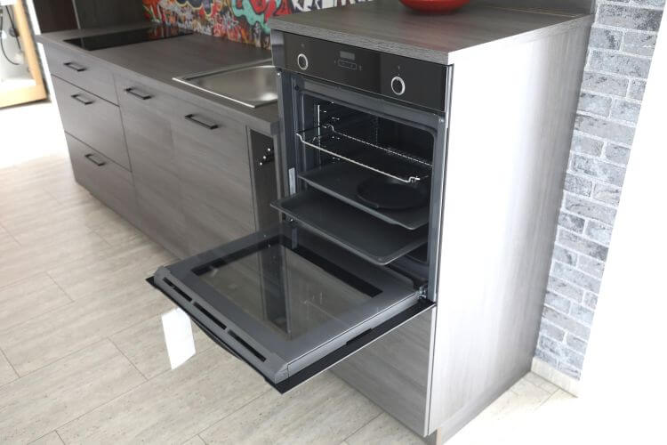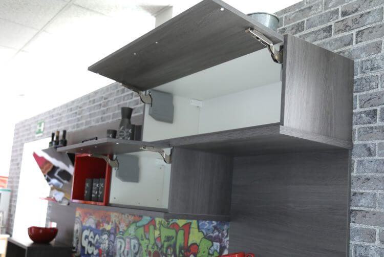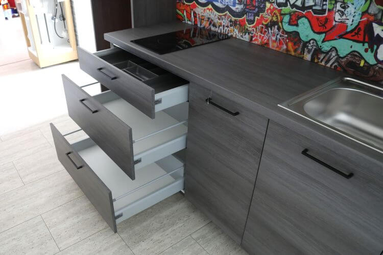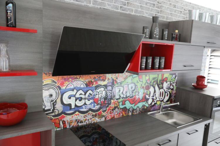 Anlieferung und Montage inklusiveDie Abverkaufsküche „Plan P11“ schafft durch die Farbkombination in Eiche grau und Marsrot glänzend in Verbindung mit der Nischenrückwand in Graffiti-Optik einen ganz modernen Stil und wird der Eyecatcher in Ihre Küche.