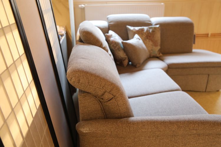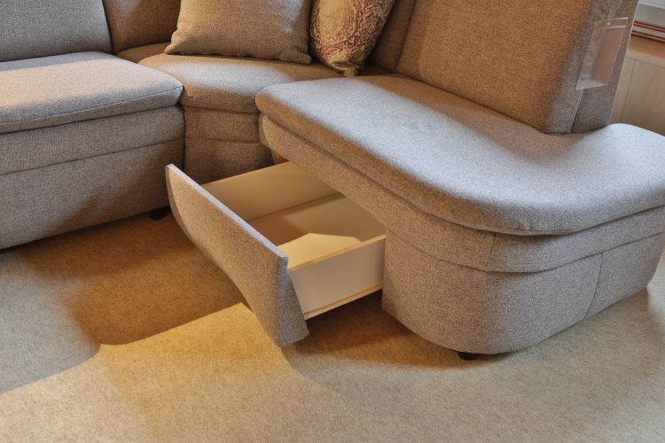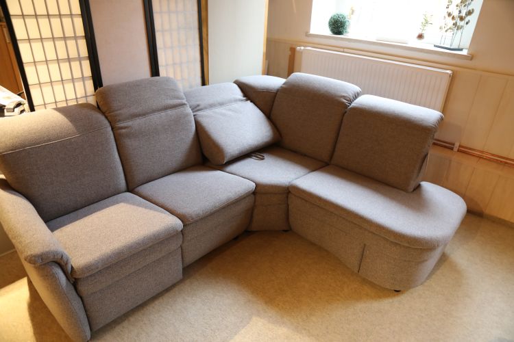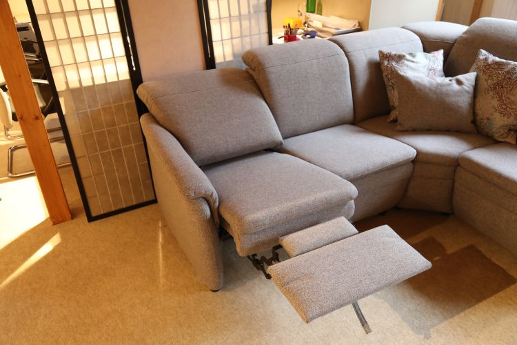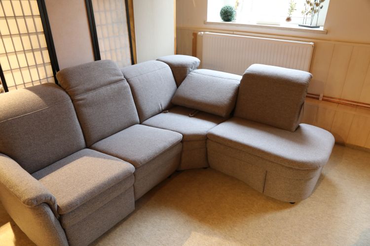 Dieses bodennahe Funktionssofa besteht aus einem 2-Sitzer mit einer Relaxfunktion, einer großen Winkelecke mit Funktion und einem Anbauteil mit Stauraumfach unter dem Sitz.