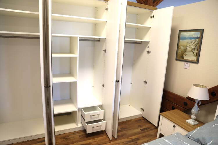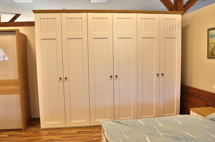 Das Schlafzimmer „LS 149120“ in Lack Weiß mit Akzenten in Wildeiche besteht aus einem Luxus-Doppelbett, 2 Nachtkonsolen und einem 6-türigen Drehtürenschrank. Die Konsolen haben je 2 Schübe mit Melallgriffen und der große Drehtürenschrank bietet Ihnen durch 3 Kleiderstangen, große und kleine Regalböden und 2 kleine Innen-Schubkästen viel Stauraum.