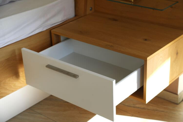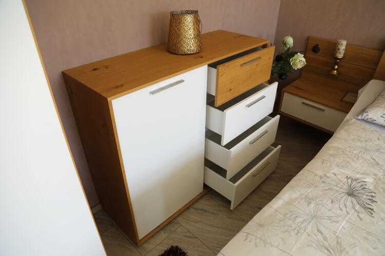 Dieses Schlafzimmer in Balkaneiche furniert und Lack weiß bringt nicht nur einen wunderschönen, natürlichen Charme in Ihr Zuhause, es steckt auch voller praktischer Funktionen.