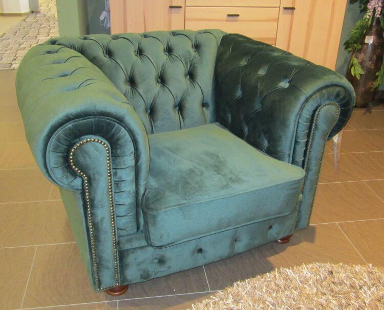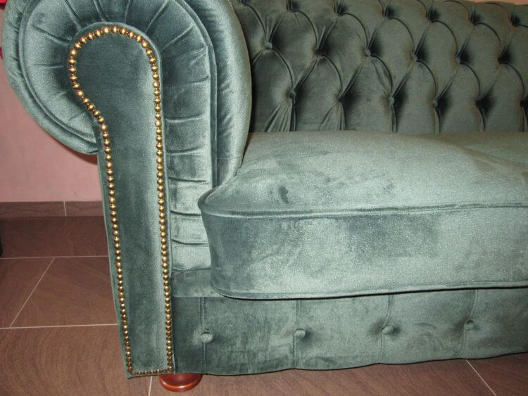 Dieses klassisch-elegante Modell im Chesterfield – Design besitzt an Rücken- und Seitenelementen eine aufwendige Rautenheftung und steht auf gedrechselten Holzfüßen. Die Armlehnen sind mit einem dekorativen Ziernagelband versehen. Die Sitzkissen liegen lose und der Bezug ist ein dunkelgrüner Microfaserstoff.