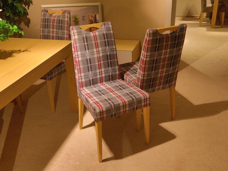 Dieser Stuhl in Natureiche bianco mit Wachseffektlack, ist mit einem schönen grau-rot karierten Stoff bezogen und besitzt eine Griffmulde an der Rückenlehne.