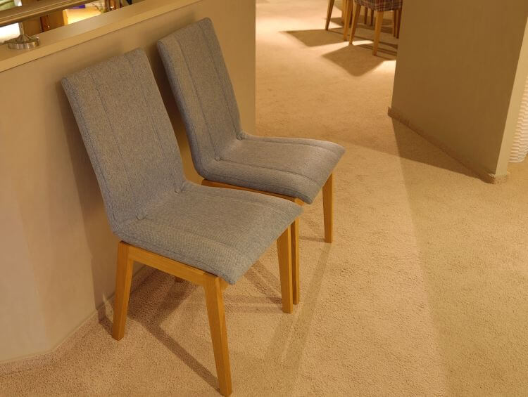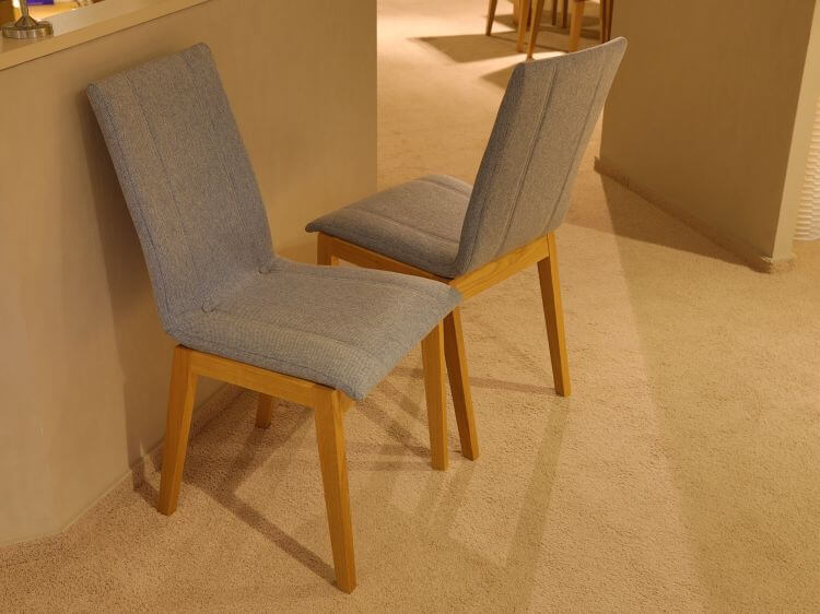 Dieser Stuhl hat ein Gestell in Eiche geölt. Rückenlehne und Sitzfläche sind mit einem Stoff in zartem grau-blau bezogen.