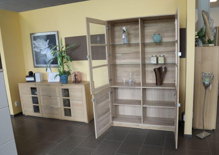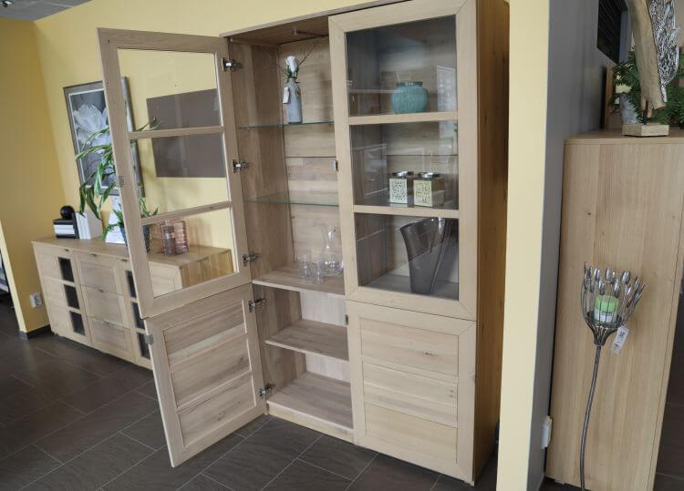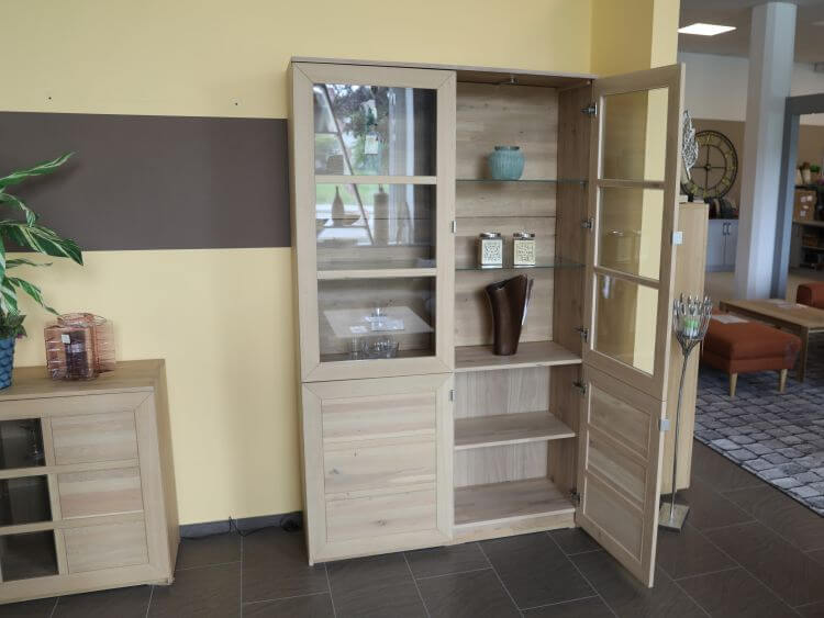 Sie suchen noch Massivholzmöbel für Ihr Esszimmer? Dann gefällt Ihnen vielleicht unsere schöne Vitrine in Natureiche bianco mit LED-Beleuchtung.