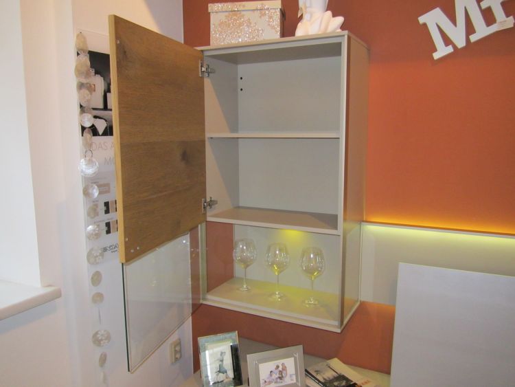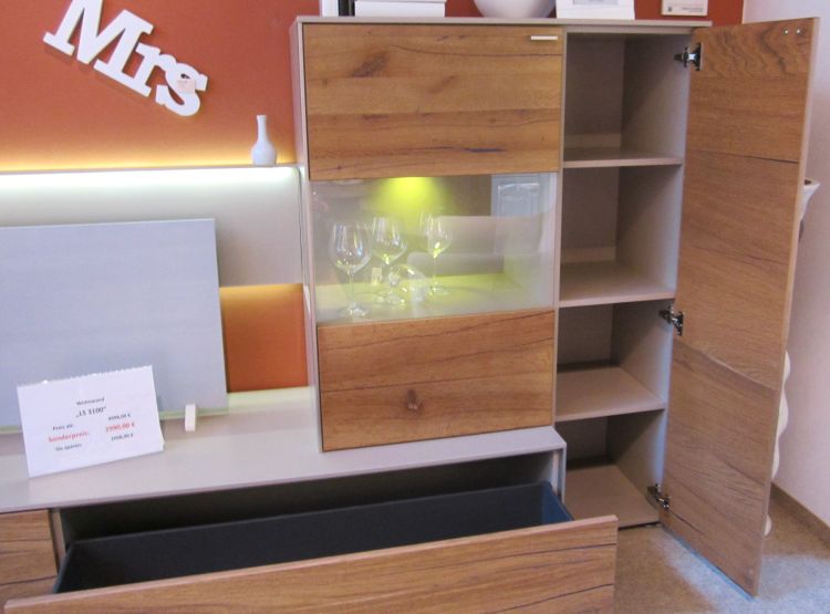 Edle Wohnwand aus Anziano Eiche und Lack sand matt, mit Beleuchtung und Paneel-Rückwand.